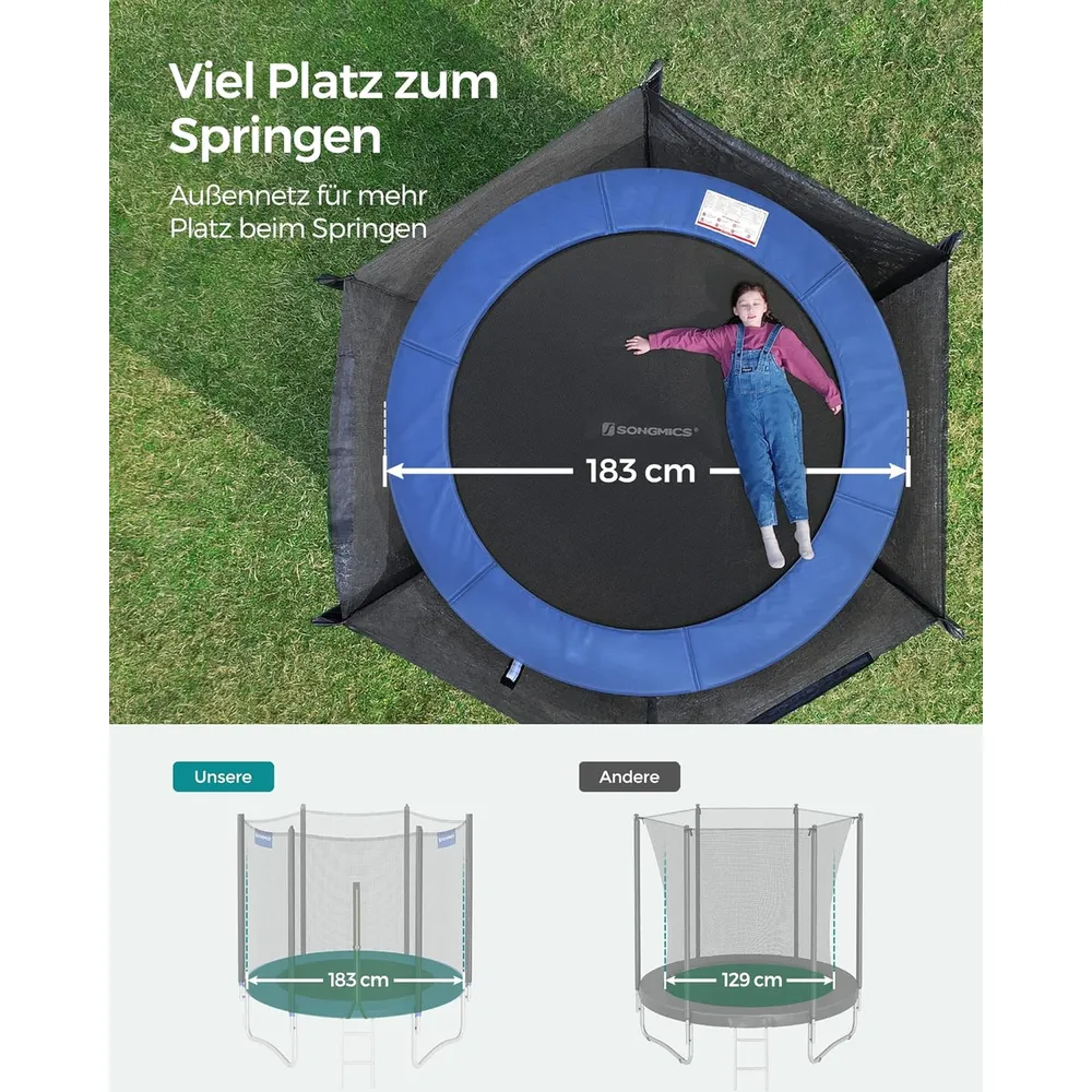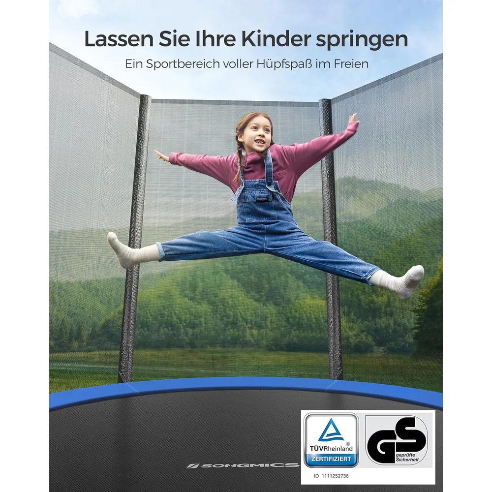 Das PP-Sprungtuch des Gartentrampolins ist reißfest, UV-resistent und langlebig, sodass Sie über viele Sommer hinweg Freude daran haben.