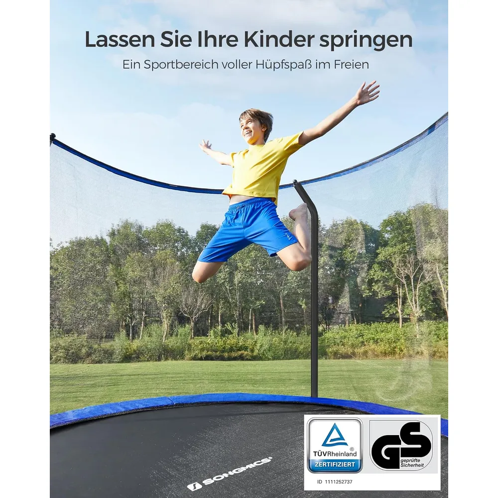 Das PP-Sprungtuch des Gartentrampolins ist reißfest, UV-resistent und langlebig, sodass Sie über viele Sommer hinweg Freude daran haben.