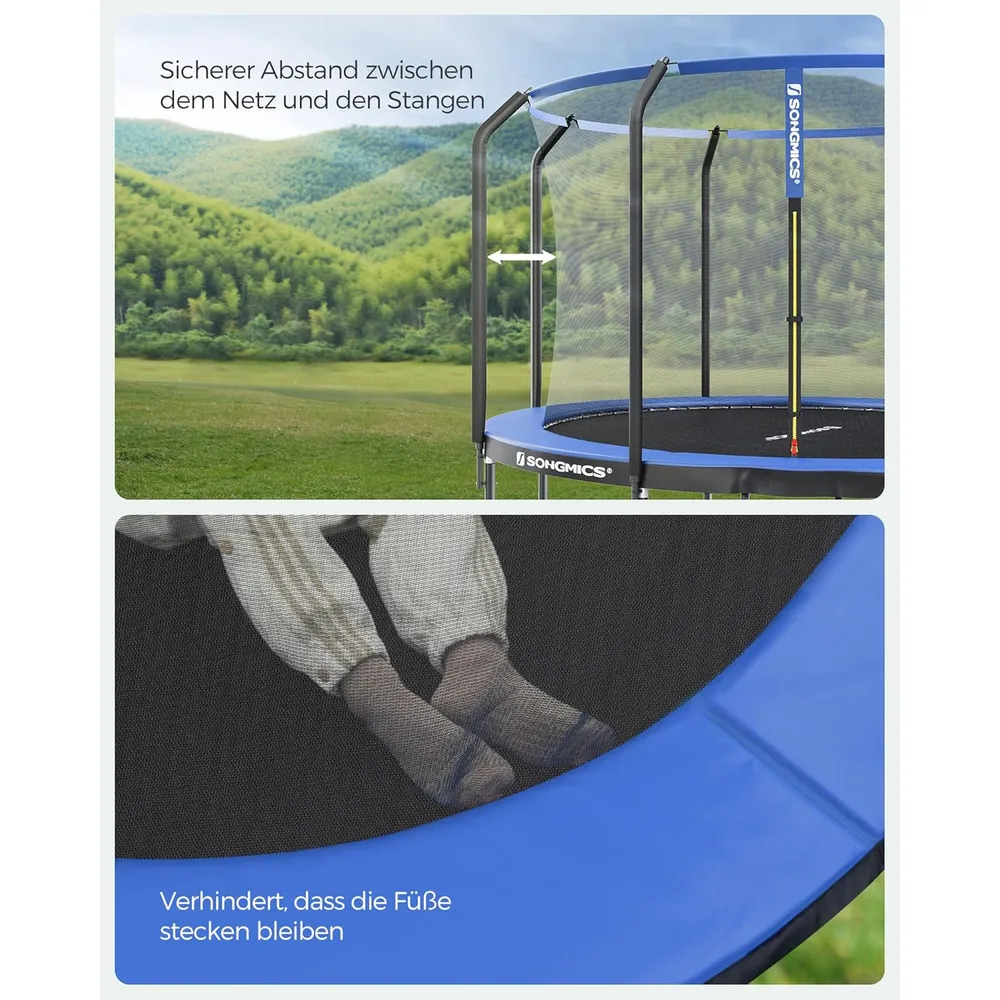 • Sprungtuch: Das hochwertige PP-Sprungtuch ist witterungsbeständig und bietet Komfort beim Springen.