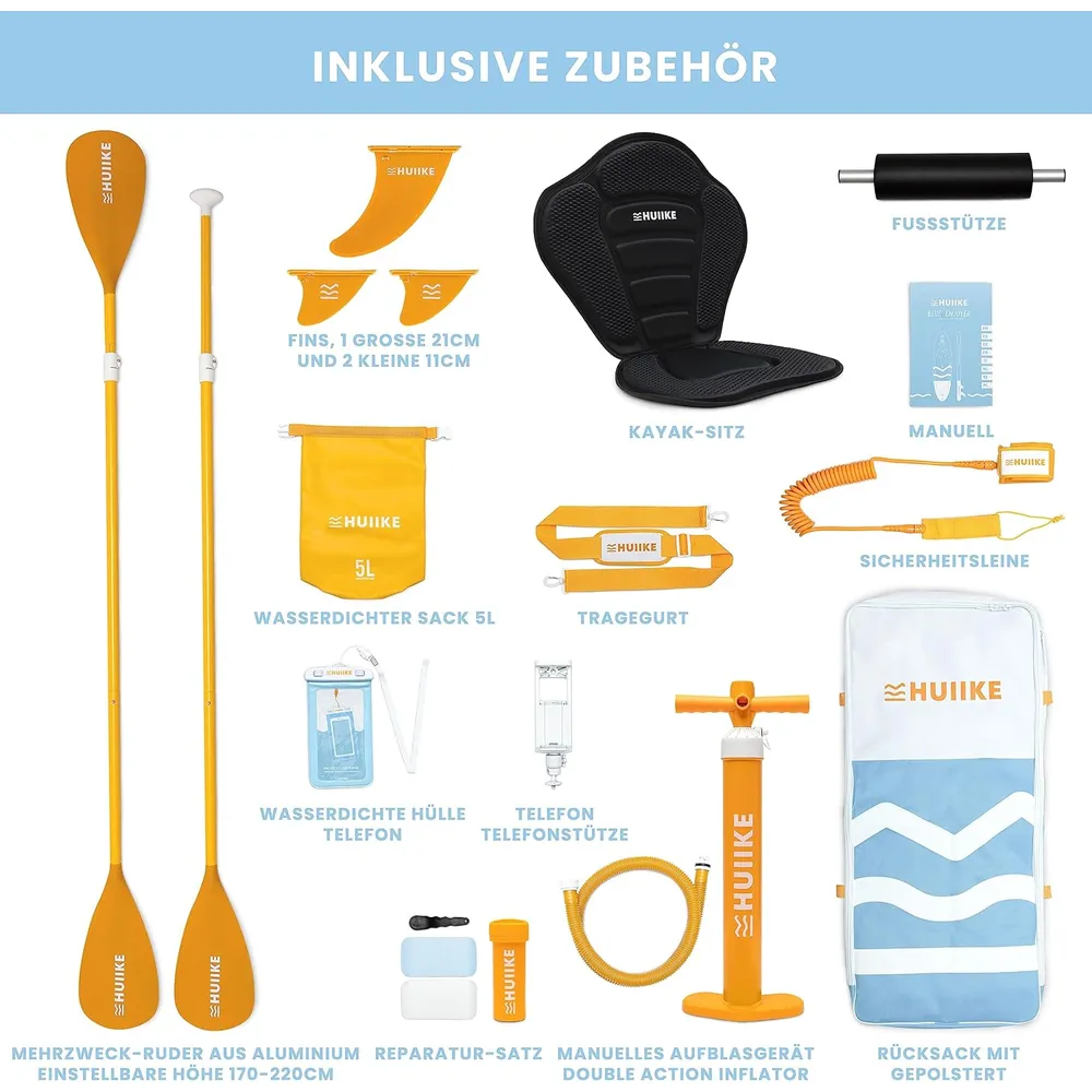 🏄‍♂️ PREMIUM STAND UP PADDLING BOARD 🏄‍♂️ The “ENJOYER” collection of our inflatable standup paddleboard contains everything you need: a blue paddle sup board, backpack, safety leash, dual hand pump, dual-use aluminum paddle, 3 fins, Kayak seat, footrest, transport strap, repair kit, waterproof bag (5L), waterproof cell phone case, cell phone holder and instructions