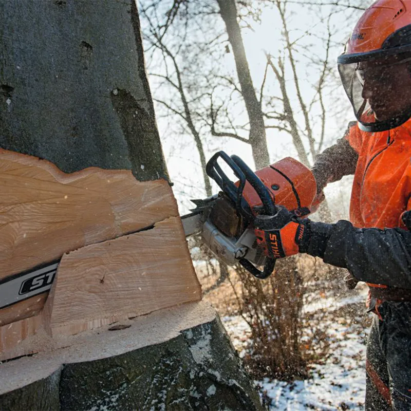 Angetrieben wird die Kettensäge von einem 5,4 kW (7,3 PS) starken STIHL 2-MIX-Motor, der dank STIHL M-Tronic eine gleichbleibend hohe Leistung sicherstellt. Die mengenregulierbare Ölpumpe versorgt zuverlässig die Schneidgarnitur mit Öl und ermöglicht den Einsatz von langen und sehr langen Schneidgarnituren.