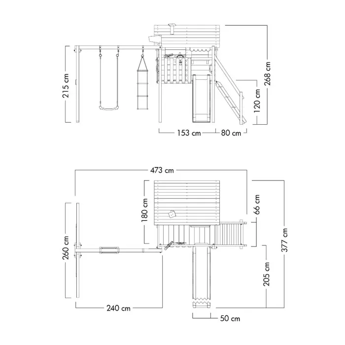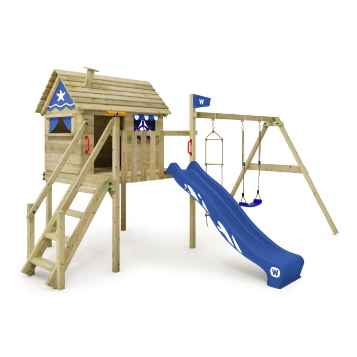 Our Smart Journey climbing frame with house is a great way to give children hours of fun in the garden. With the help of the rope ladder and swing, children can climb, swing and also improve their coordination and motor skills at the same time. The playhouse built on stilts is a real eye-catcher and offers children their own little world to play and hide in. The wave slide and 120 cm high platform add even more fun and enough space for endless adventures. Our Smart Journey provides stability for your kids to play, while transforming your garden into an exciting playground that stimulates their creativity and imagination.