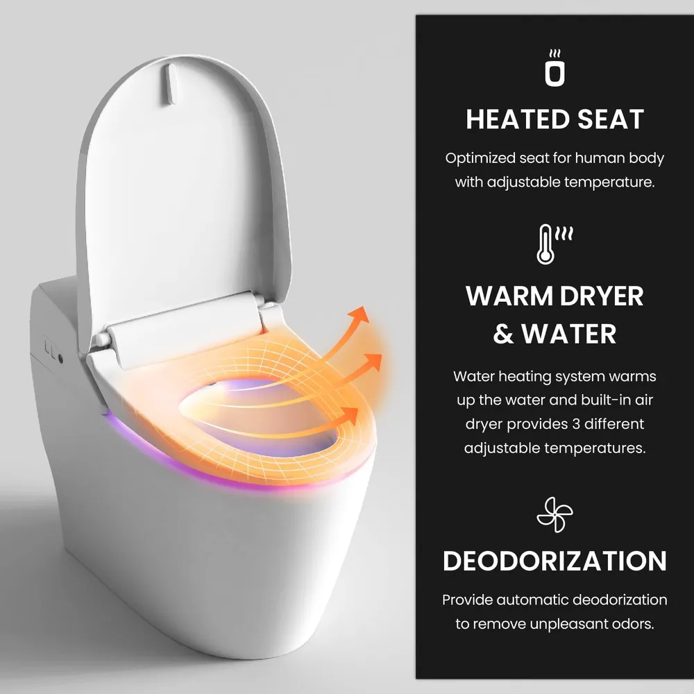 - 💧 HEATED SEAT / WARM WATER / WARM DRYER – Premium bidet features with a self-cleaning stainless steel nozzle and auto deodorization