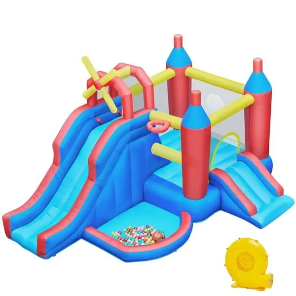 - 【Add Fun To Backyard For Kids】Experience hours of backyard fun with this 7-in-1 bounce house! Packed with fun features, it includes a 7.2′ long slide, a 5.6′ L × 5.4′ W bouncing area, a ball pit, a basketball hoop, a climbing wall, a smaller slide, and a dart game. Suitable for up to 3 kids aged 3 to 10 (with a maximum weight of 99 lb for each kid).