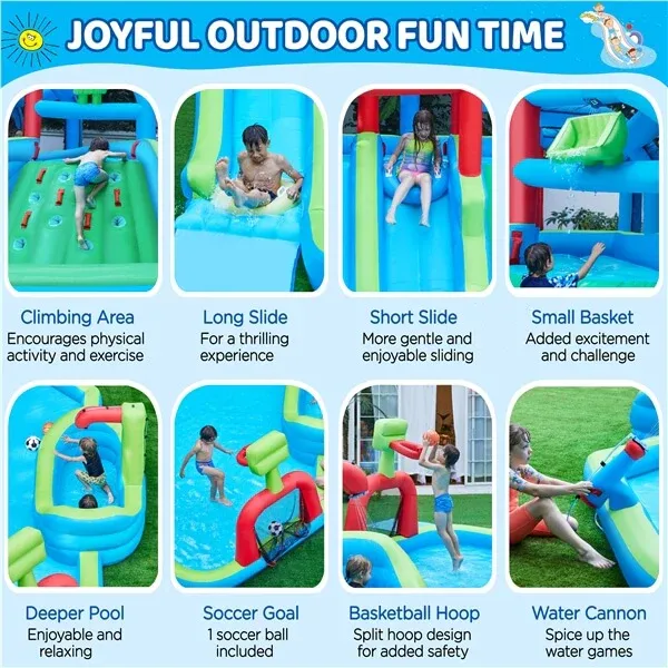 - 【Slide Into A Refreshing Summer】This double-slide inflatable water park is packed with thrilling features, including 2 water slides, a splash pool, a deeper pool, a basketball hoop, a soccer goal, a water cannon, and a climbing wall with footholds. The extended slide and water basket atop the climbing wall take the excitement to new heights.