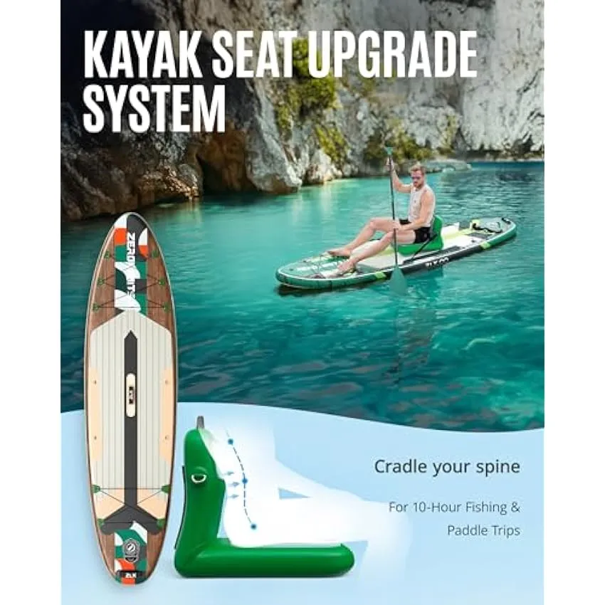 - 【Upgraded Kayak Seat & Wide Stability】Measuring 10’6″ x 33″ x 6″ and equipped with StabilTrac Fin, ZLX inflatable stand up paddle board provides more balance area and reduces tipping risk by 30% than standard SUPs for your ride. The ultra-wide deck securely holds up to 450 lbs, ideal for tandem paddlers, fishing, or yoga. Plus, the inflatable kayak seat’s spine-matching curved backrest enhances comfort and stability, making it perfect for relaxing or practicing on the water.