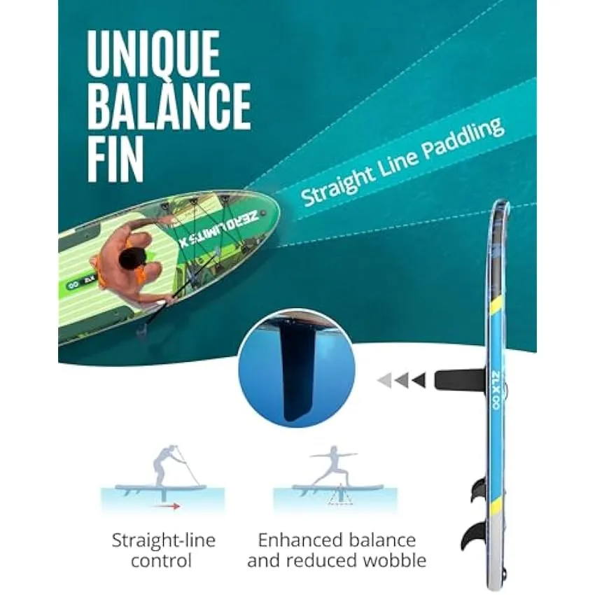 - 【Patented Surf-steady & Unbeatable Control】A game-changer for your water adventures! Engineered with exclusive StabilTrac Balance Fin and 3 fins, ZLX paddle board delivers 30% better tracking accuracy and all-level stability for beginners, dramatically minimizing sideways drift on inflatable paddle boards. Unlike generic fins, ZLX center stabilizer acts as an underwater anchor, reducing wobbles while keeping turns agile.