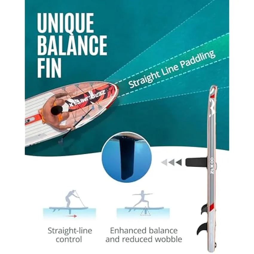 - 【Patented Surf-steady & Unbeatable Control】A game-changer for your water adventures! Engineered with exclusive StabilTrac Balance Fin and 3 fins, ZLX paddle board delivers 30% better tracking accuracy and all-level stability for beginners, dramatically minimizing sideways drift on inflatable paddle boards. Unlike generic fins, ZLX center stabilizer acts as an underwater anchor, reducing wobbles while keeping turns agile.