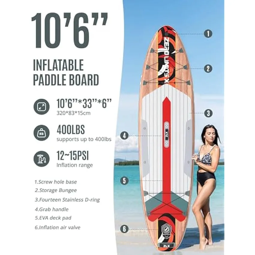 - 【Upgraded Kayak Seat & Wide Stability】Measuring 10’6″ x 33″ x 6″ and equipped with StabilTrac Fin, ZLX inflatable stand up paddle board provides more balance area and reduces tipping risk by 30% than standard SUPs for your ride. The ultra-wide deck securely holds up to 450 lbs, ideal for tandem paddlers, fishing, or yoga. Plus, the inflatable kayak seat’s spine-matching curved backrest enhances comfort and stability, making it perfect for relaxing or practicing on the water.