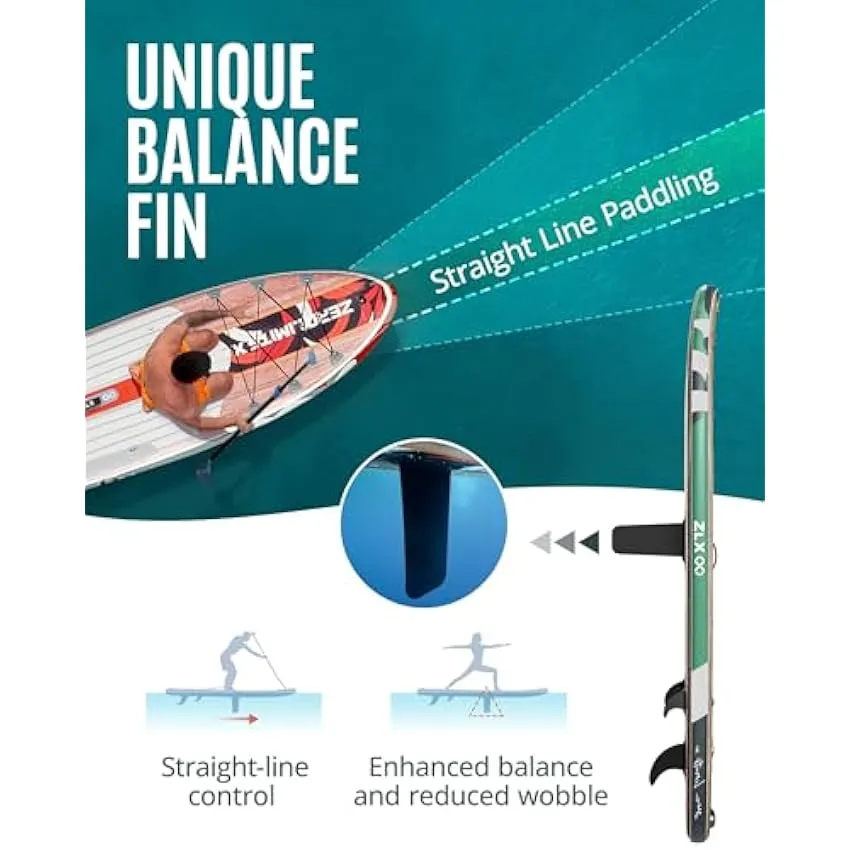 - 【Patented Surf-steady & Unbeatable Control】A game-changer for your water adventures! Engineered with exclusive StabilTrac Balance Fin and 3 fins, ZLX paddle board delivers 30% better tracking accuracy and all-level stability for beginners, dramatically minimizing sideways drift on inflatable paddle boards. Unlike generic fins, ZLX center stabilizer acts as an underwater anchor, reducing wobbles while keeping turns agile.