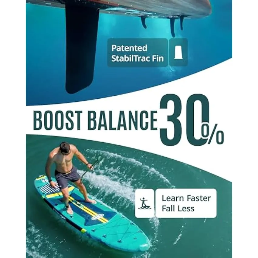 - 【PATENTED CONTROL】: Exclusive StabilTrac Balance Fin dramatically minimizes sideways drift on inflatable paddle boards, perfect for yoga flows, fishing trips, or coastal waves. Unlike generic fins, our center stabilizer actively counters lateral movement, keeping beginners steady through uneven strokes.