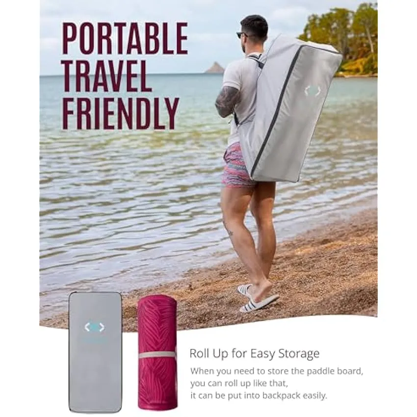 - 【ULTIMATE PORTABILITY】: This blow-up paddle board rolls into a lightweight backpack (included) for hands-free hiking to remote lakes and coastal beaches – 30% more compact than wooden boards. Fits effortlessly in car trunks or apartment closets, with rapid inflation (Upgraded pump included) ready for lake adventures and beach days in under 8 minutes